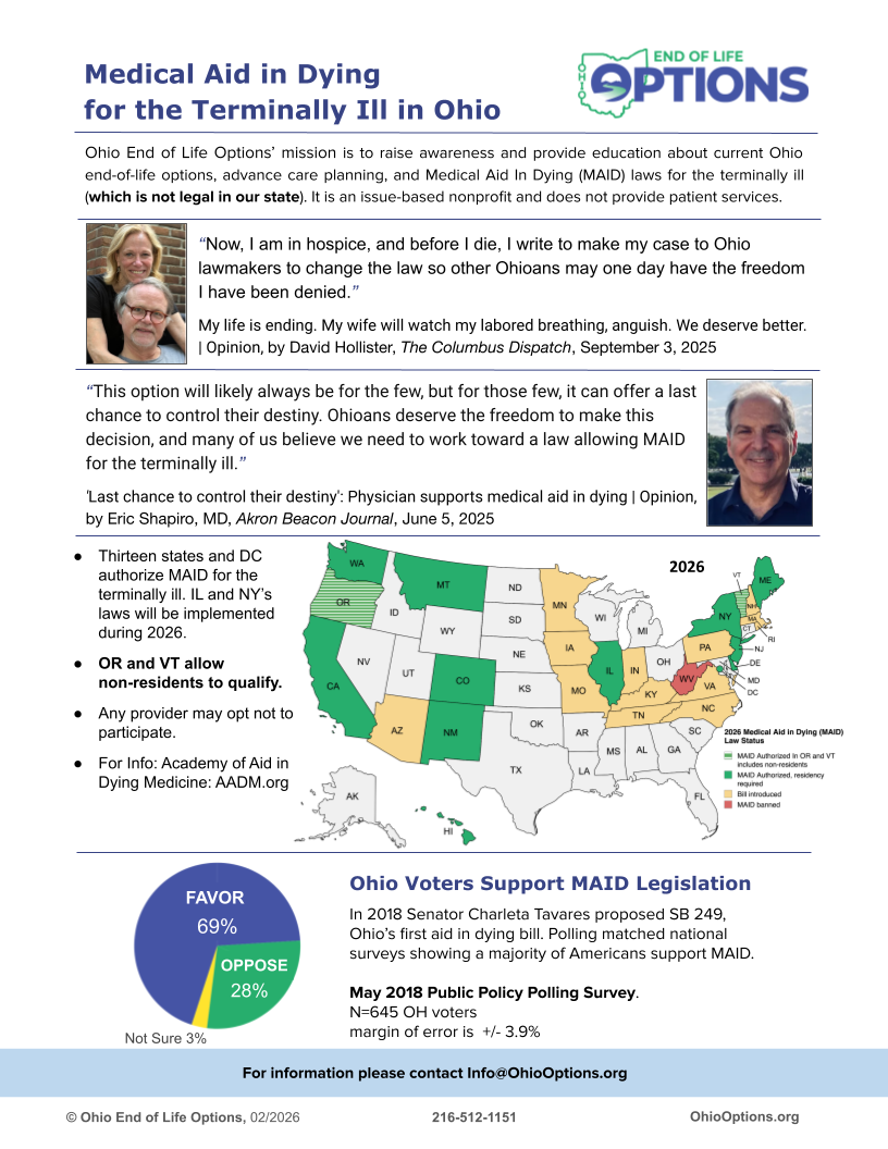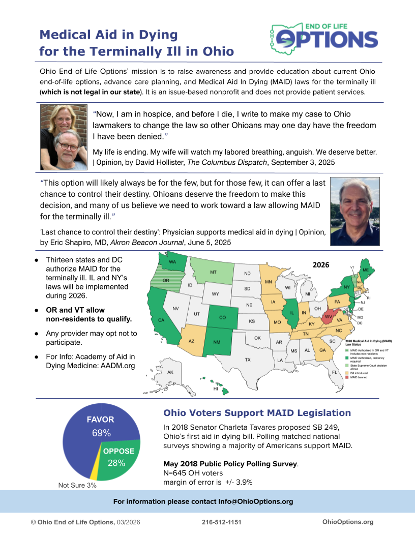 “This option will likely always be for the few, but for those few, it can offer a last chance to control their destiny. Ohioans deserve the freedom to make this decision, and many of us believe we need to work toward a law allowing MAID for the terminally ill.”