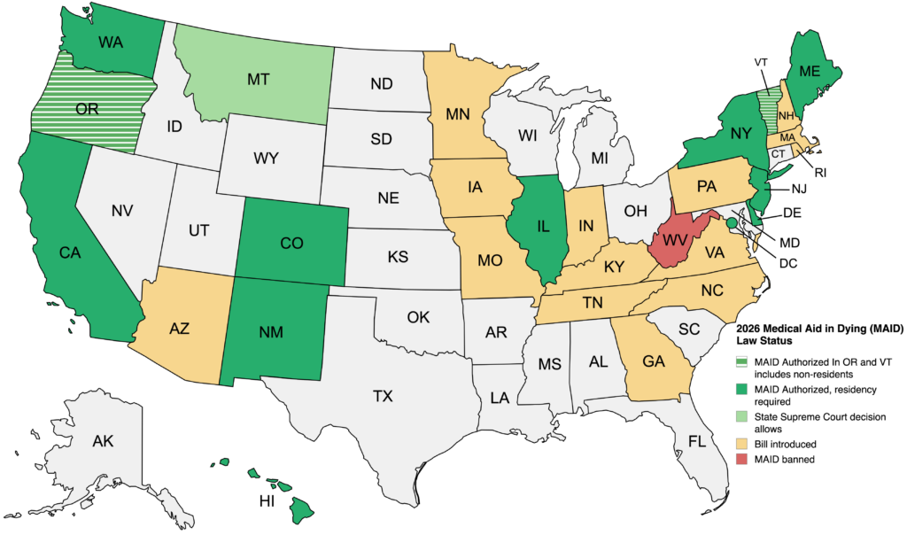 Thirteen states and DC allow access to MAID for the terminally ill.